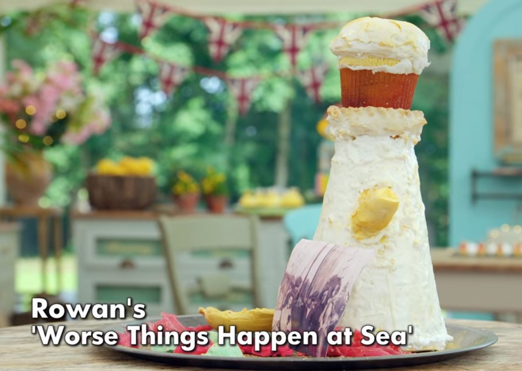 The heat melts everyone’s ice cream really quickly – Mark says it’s around 35 C (~102 F) – and the bakers have a lot of trouble assembling their cakes. Maybe they should have rescheduled this week? Most bakers manage to get things to set, but Laura and Lottie have a lot of trouble keeping their cakes in shape; Laura’s cake falls apart in the freezer. Here’s how the showstoppers all turned out; ice cream in various states!