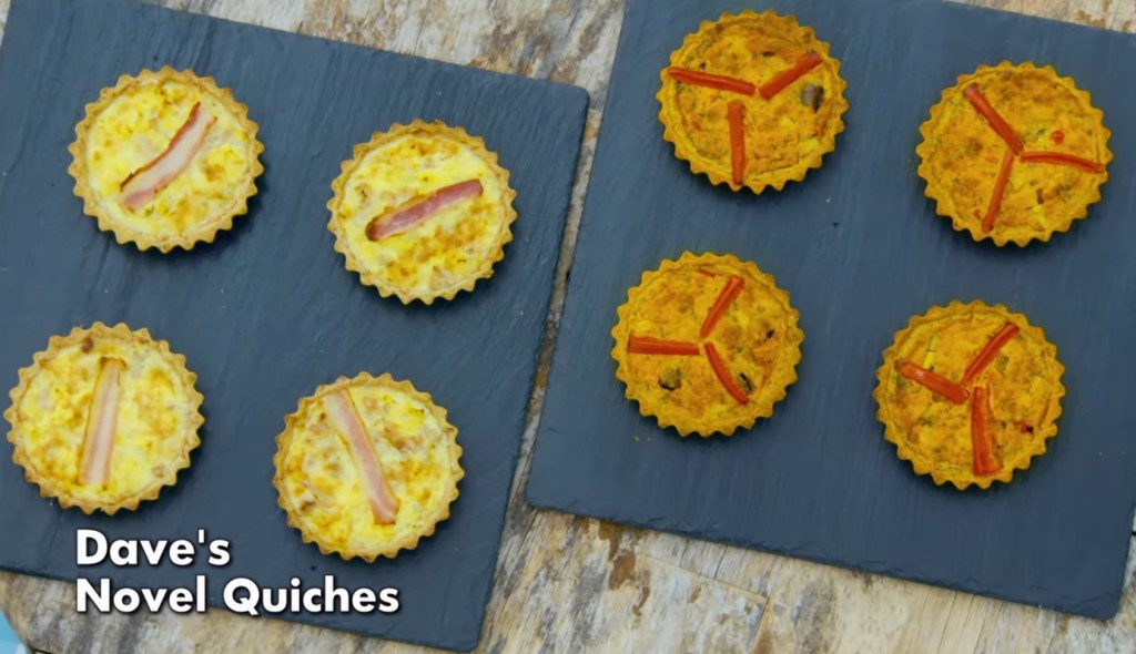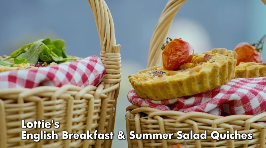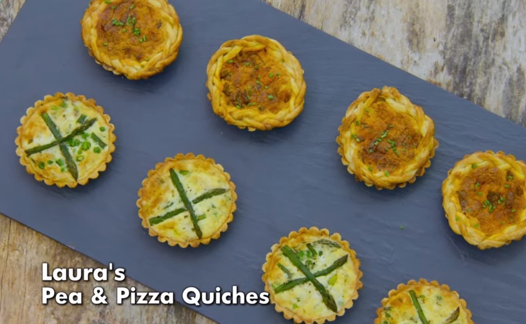 Flavors and ingredients run the gamut here – Lottie is using baked beans, and she and Dave are both doing “English breakfast” quiches; Laura is creating a “pea and pizza” quiche, and Marc uses smoked haddock for his quiche. Despite the heat, the bakers all manage get their quiches done. Here’s how they turned out!