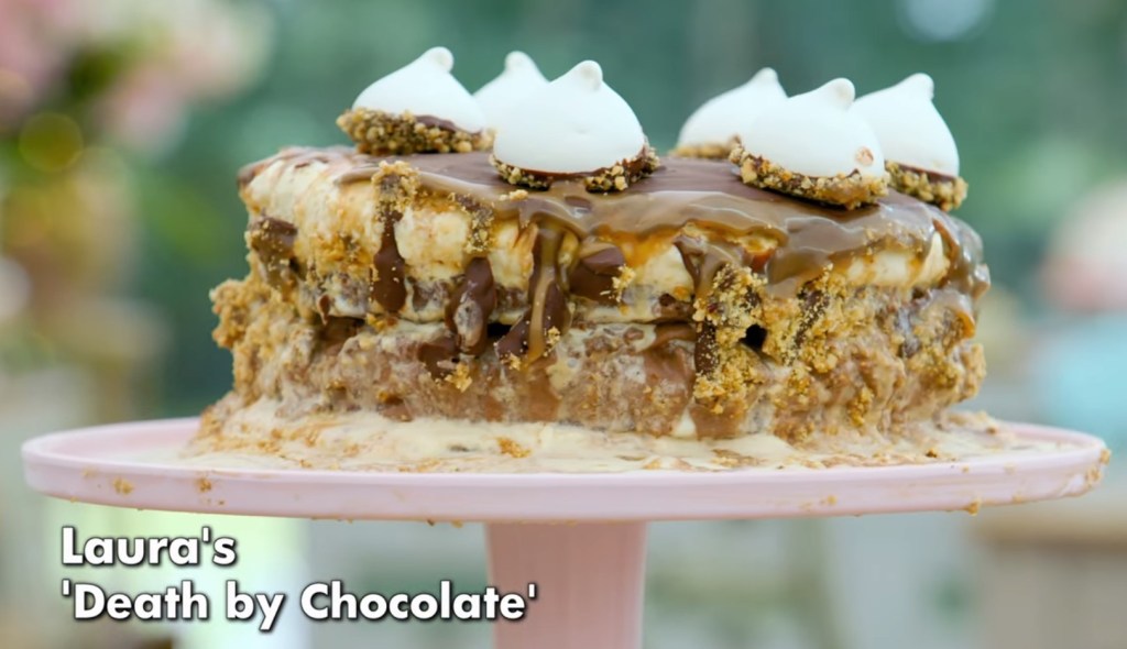 Re-imagining ice cream cake (in 4.5 hours) is the challenge for the showstopper, and it must contain a baked element. With the heat, ice cream will probably prove to be a difficult ingredient to work with for this challenge… Matt lets us know the bakers will be using ice cream makers, so at least that’s one hurdle seemingly overcome in the battle with the heat? The bakers certainly take some risks: Dave plans to pipe ice cream on top of his cake, while Lottie plans to coat her entire cake all around in chocolate ice cream. Laura’s ice cream doesn’t turn out because she forgets to turn on the ice setting; she’s left with a chocolate mixture – she turns on the ice setting and chucks in the freezer.